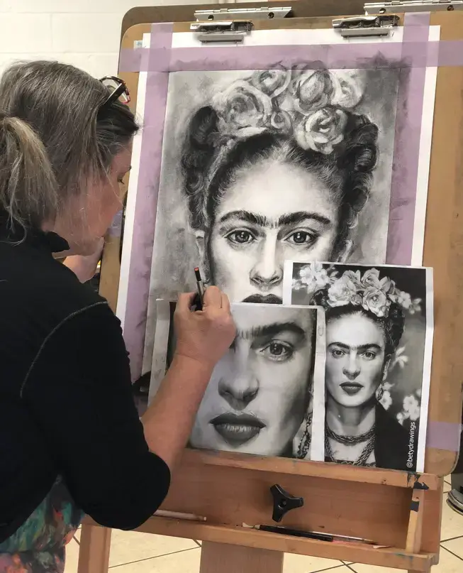 The curriculum includes contour, cross-contour, negative space, perspective, understanding of value and basic shading techniques, primarily using pencil and paper. Once these core skills are mastered, students transition to charcoal and soft pastels to deepen their understanding of values and shading.